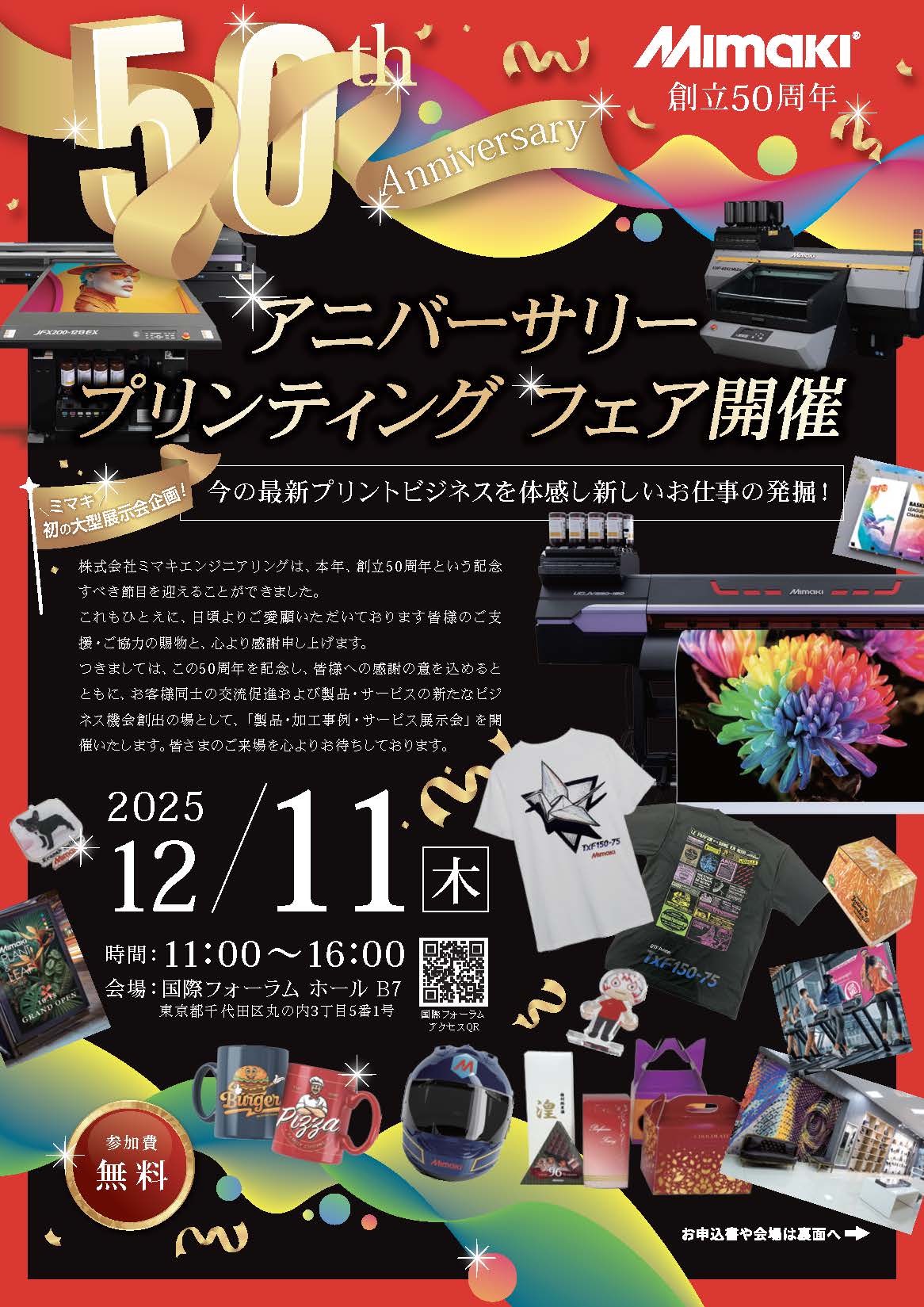 ㈱ミマキエンジニアリングは創立50周年を迎えたことを記念し、ユーザーの交流促進、新たなビジネス機会創出の場として、「アニバーサリープリンティングフェア」を12月11日に東京国際フォーラムで開催する。