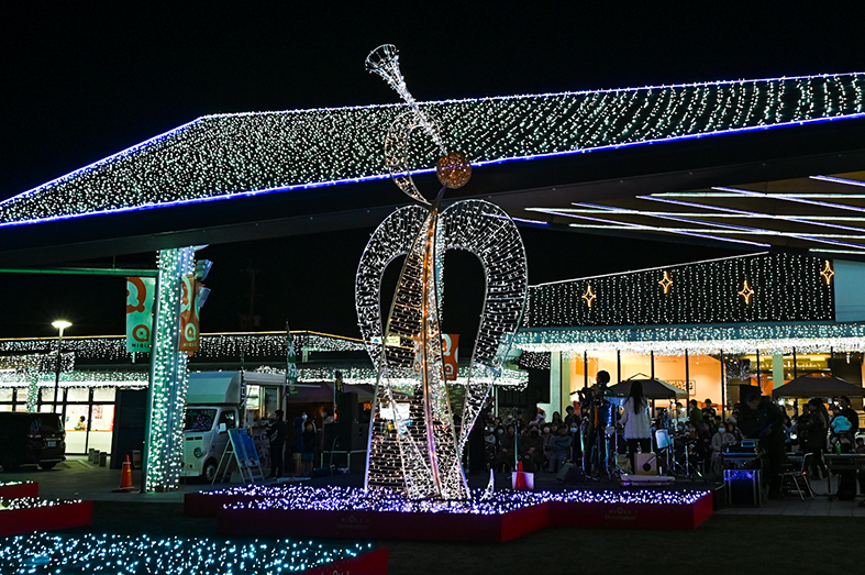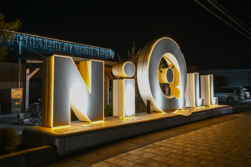 芝生広場には、シンボルとなる大型のオブジェを設置したほか、イルミネーションを一面に張り巡らし幻想的な空間を演出。また、特徴的なデザインのイベント広場天井や屋根は、その魅力を引き立てるよう線と面で色とりどりに装飾されていて、国道側の”NiQLL”ロードサインはNiQLLカラーで彩った。