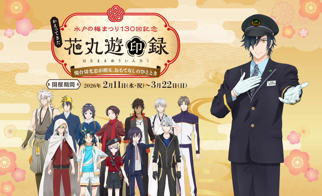 演出を担うのは、「偕楽園 UME The Lights 2026」も手掛ける歴史と光と影をテーマに活動する空間演出チーム「陰翳 IN-EI」。偕楽園の自然と歴史に寄り添いながら、刀剣男士たちを“余韻”として描き出す。さらに、アニメ『刀剣乱舞-花丸-』から厳選した楽曲を和の響きと融合させたリミテッドミックスのBGMに乗せて3振りの撮り下ろしボイスを聞くことができる。