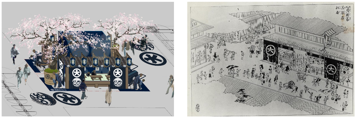 4階 東側/西側 「描かれた大丸~動く浮世絵」。大丸が描かれた浮世絵の一部が動き出す映像の展示。生花の桜の装飾とともに、シースルービジョンを使用して浮世絵を投影する。