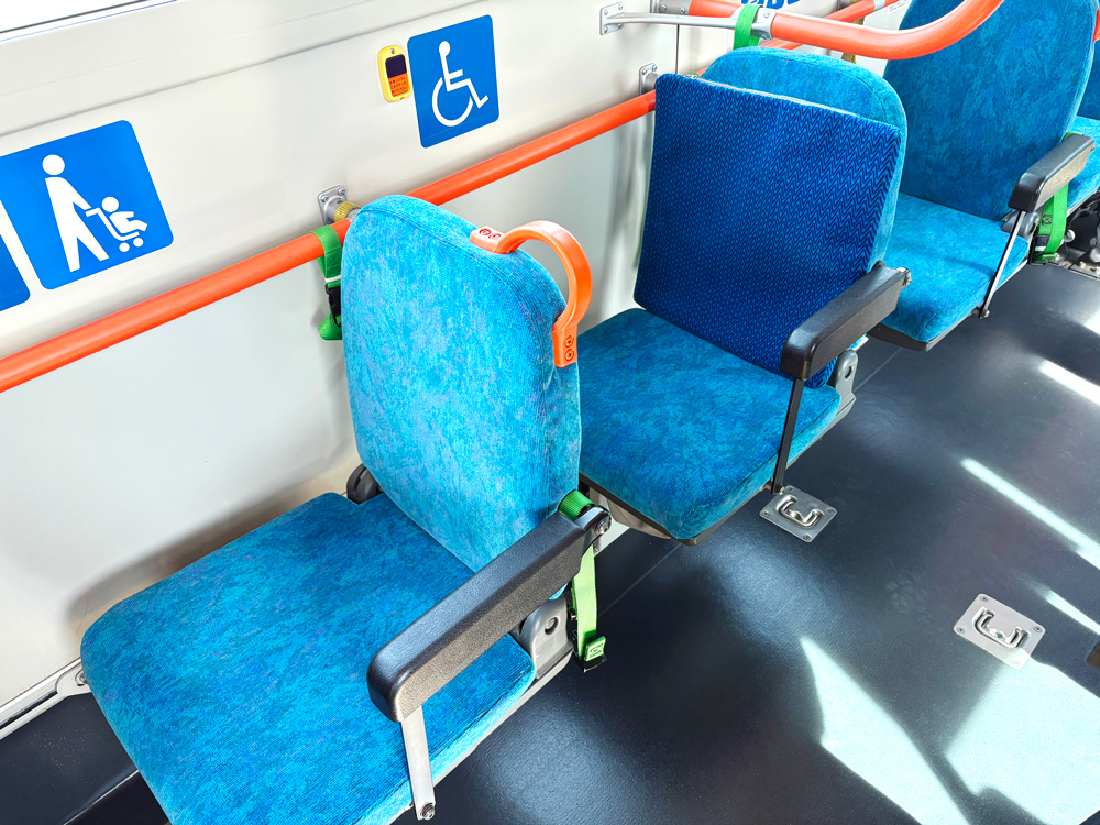 座席も新2000系車両のモケットを使用。奥の座席には元々バスで使っていた紺色のモケット。