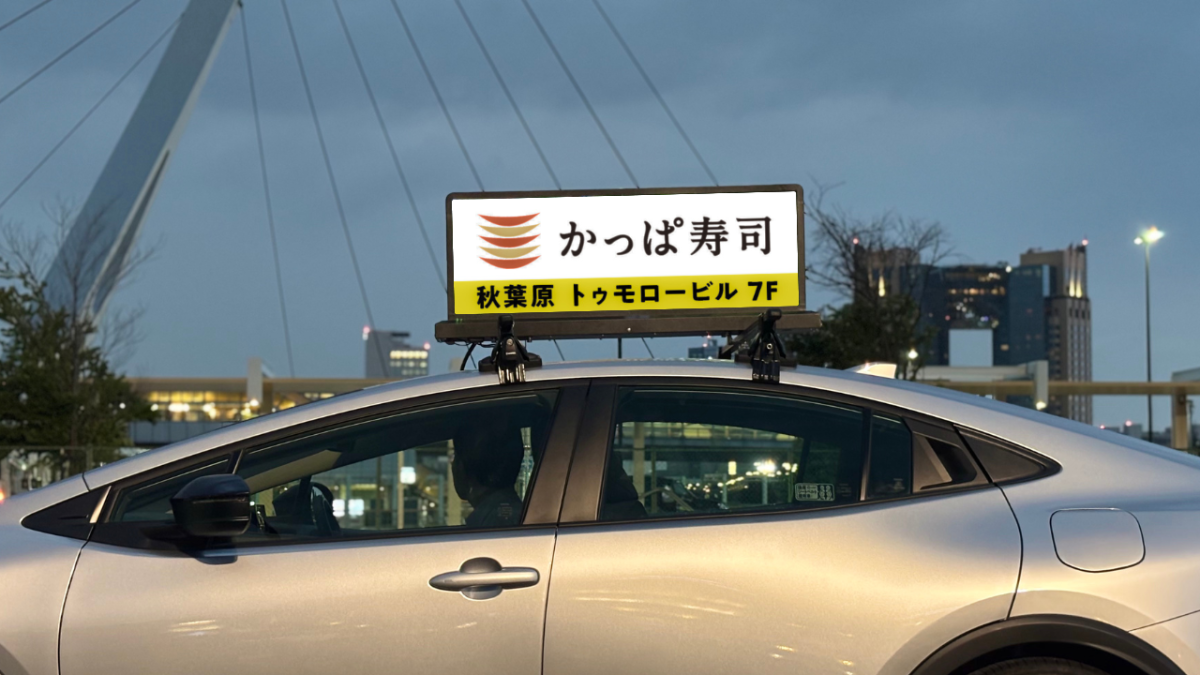 モビリティ広告プラットフォーム『WithDrive』を運営する㈱Essenは10月1日から、カッパ・クリエイト㈱が運営する人気回転寿司ブランド「かっぱ寿司」と共同で、乗用車を活用したデジタルサイネージ広告の実証実験を期間限定で実施する。