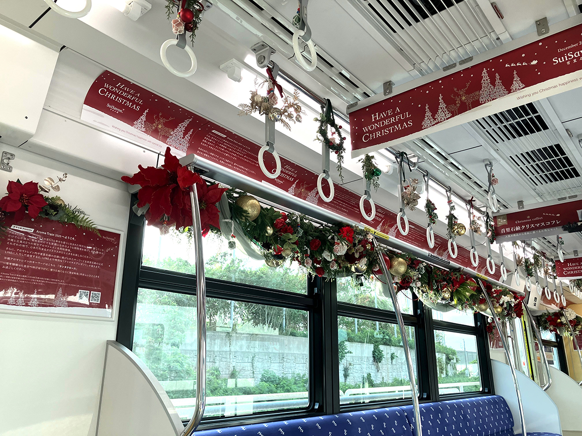 ㈱首里石鹸が展開する沖縄発スキンケアブランド“SuiSavon-首里石鹸-”は、沖縄都市モノレール㈱、広島電鉄㈱とタイアップし、クリスマス装飾と首里石鹸の「ボタニカルハンドメイド洗顔石鹸CUBE」をあしらった、癒しの香り広がる「アロマトレイン2025」を運行する。