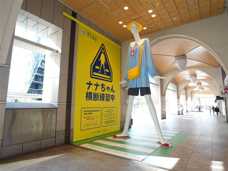 「ナナちゃん人形」のコラボ(写真)は1月21日から27日まで、4月の入学前の備えを呼びかける目的で、ナナちゃん人形が「横断歩道を渡る練習をする園児姿」に変身。ナナちゃん人形が渡る横断歩道は、名古屋市が導入を進めている緑色のカラー化を施したデザイン。子供たちを守るため、通学路であることを示し、ドライバーに対して注意を促している。