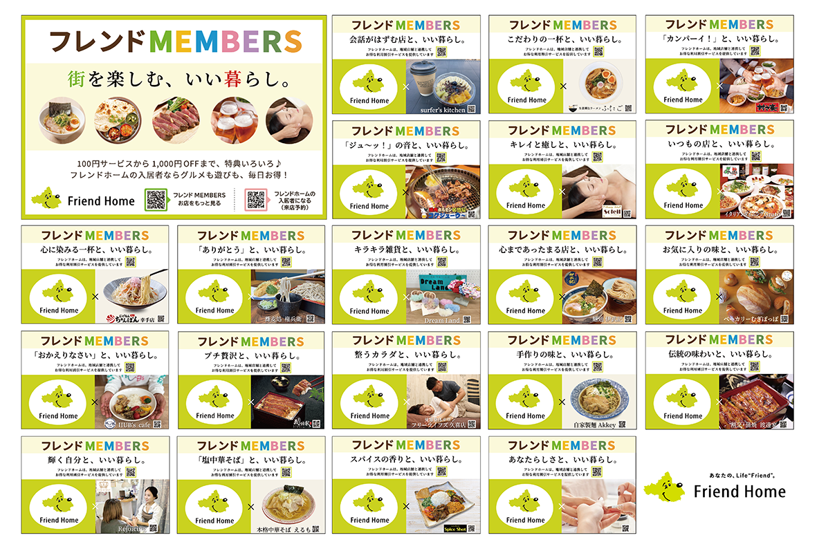 ㈱フレンドホームは1月27日、入居者向け特別優待制度「フレンドMEMBERS(フレンドメンバーズ)」に参画する協賛店のうち、同社の想いに感し名乗りを上げてくださった地域の20店舗とともに、オリジナルのコラボレーション看板の制作・設置を開始した。
