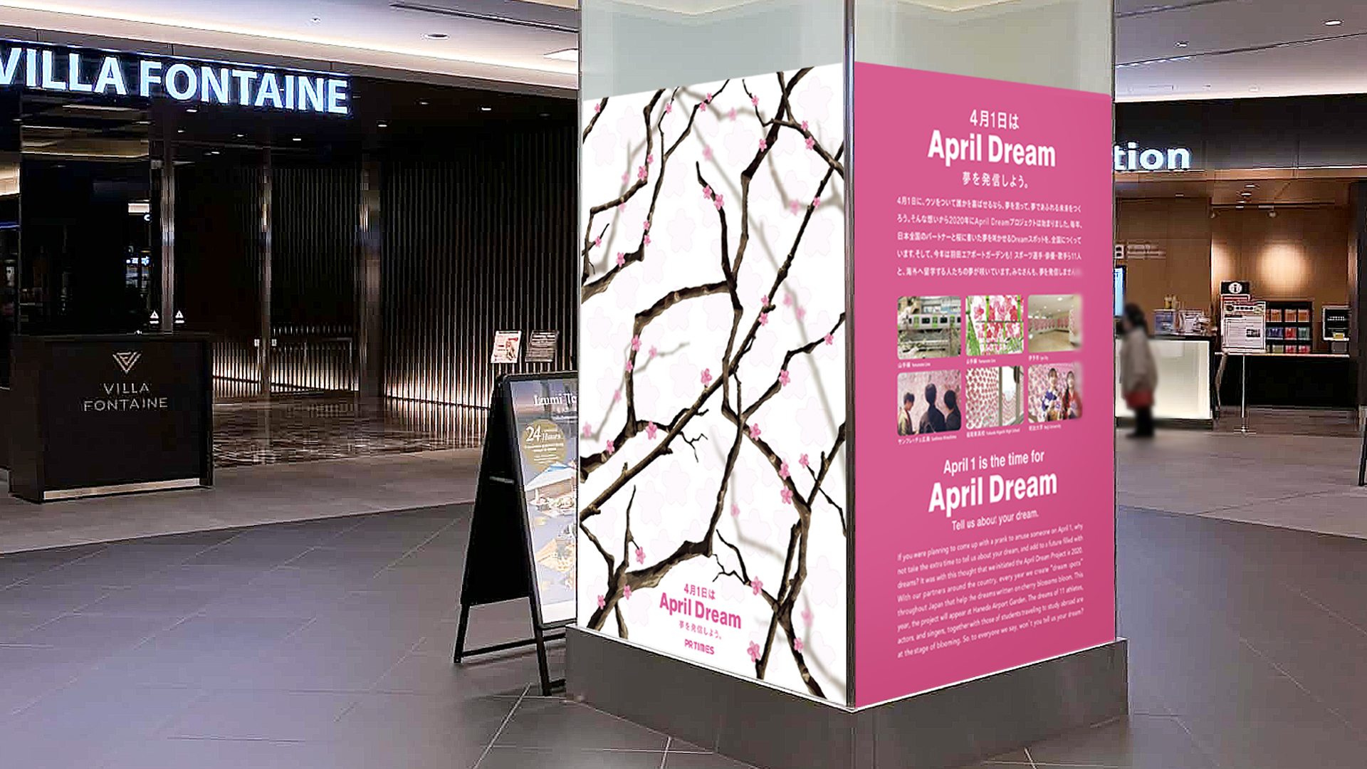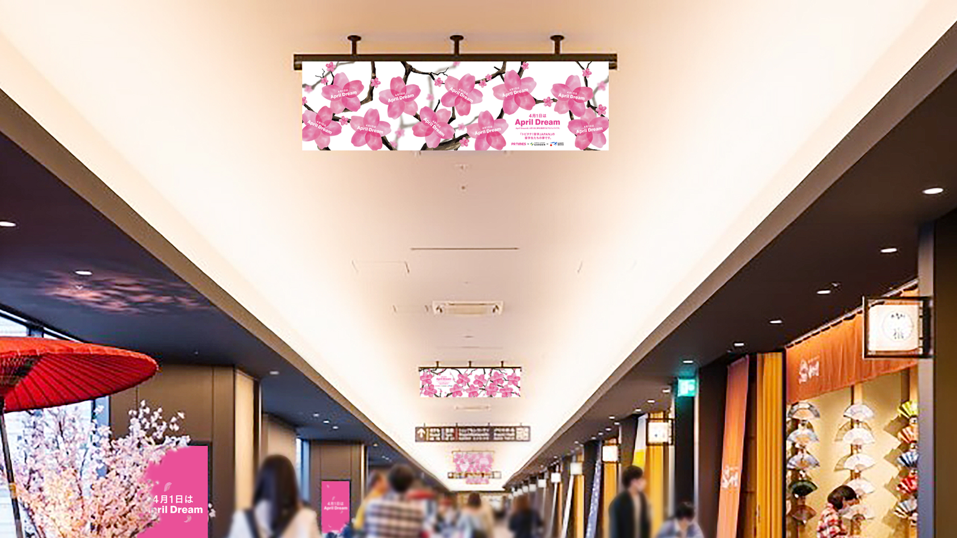 お土産店などが並んだ「ジャパンプロムナード」の天井には留学生の夢が綴られた夢の桜を掲示。また、施設内18ヶ所に配置された縦型のサイネージでは「4月1日はApril Dream」を英語と日本語で表示する。そして、接続口から進んだ最奥のイベントスペース「グランドホワイエ」では、April Dreamに賛同し、全国で夢を発信できる場所を作っている「Dreamパートナー」の活動を収めた特別映像を2026年4月1日より放映する。