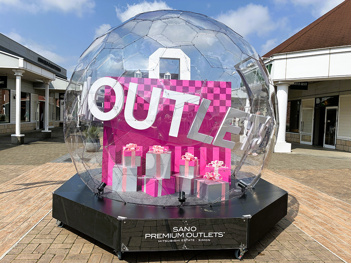 もうひとつは、透明なドーム型フォトスポット。内部にはショッピングバッグやギフトボックスをモチーフにしたオブジェを配置し、「買い物を楽しむ場」としての施設コンセプトを視覚的に表現した。さらに本スポットは、出店ブランド向けの広告スペースとしても活用可能で、ブランドの世界観発信や認知向上を図るプロモーションの場としての役割も担う。