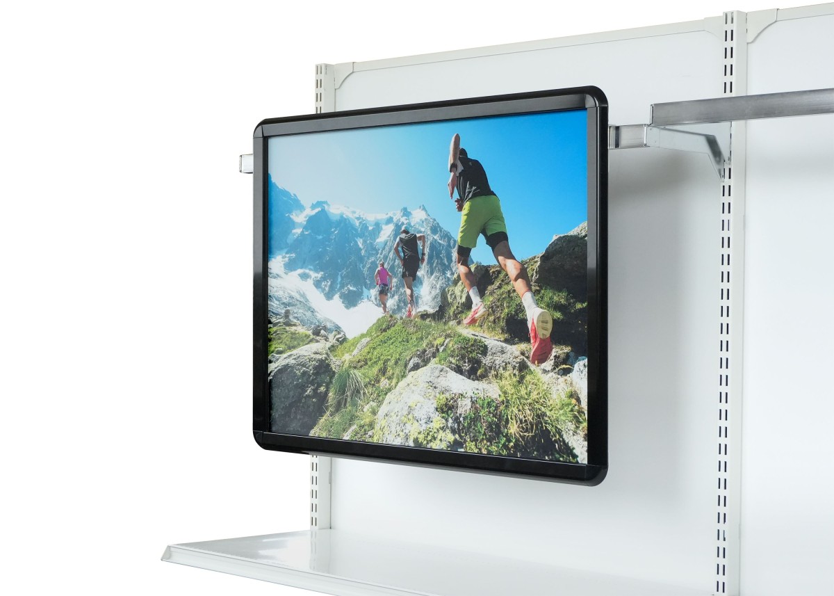コの字金具は、タテ型・ヨコ型いずれの向きにも付属のビスで取り付けが可能。簡単設置、移動も可能なことから、シーンに合わせた効果的なPRができる。量販店舗、商業・公共施設などでの利用に適している。