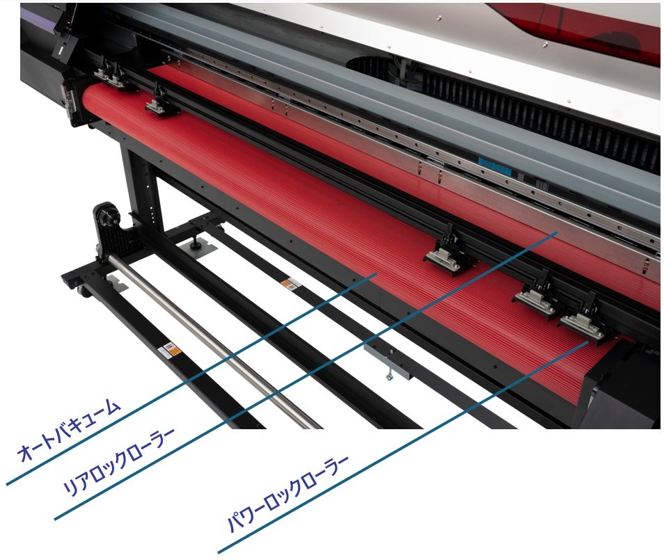 様々なロール素材への安定した出力を実現するため、同社は新たに開発したベルト搬送システムを採用。従来のグリットローラーによる搬送方式では対応が難しかった薄手のフィルムや布地も、弛みやシワの発生を抑えながら安定して搬送することが可能となっている。これにより、ウィンドウグラフィックやファブリックサインなど用途を広げ、展示会ブースや店舗空間のグラフィックも一括して提案できる。