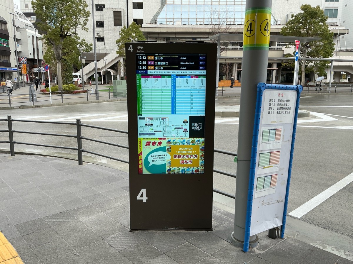 【富士フイルムイメージングシステムズ】調布市から受託した『調布駅前広場バス運行案内デジタルサイネージ設置業務』において調布駅前広場にデジタルバス停システム・デジタルサイネージ「MORA FOR BUS STOP」を計10台設置。4月1日から運用を開始