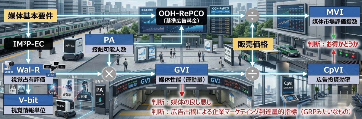 VIMSは、①V-bit(視覚情報単位)②Wai-R(視覚占有量)③PA(接触可能人数)④GVI(媒体特性)⑤CpVI(広告投資効率)⑥MVI(媒体市場評価指数)の6つの指標で構成している。これらを用いて、OOH広告媒体の能力や価値、投資効率を「視覚情報量」という共通尺度で定量的に評価できる点が特長だ。従来は経験や慣習に依存していた媒体評価を、客観的かつ比較可能な指標として整理できる。