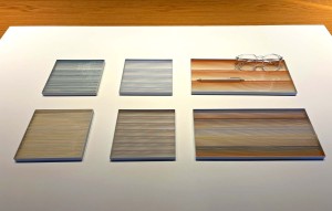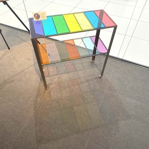 | 14枚のカラーガラスを天板にした2段のテーブル。ガラスは自由に入れ替え可能。ガラス越しの下段のガラス、床に落ちた色付きの影、これらを見た使用者に「色について考える」きっかけを提供する。 |