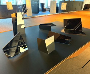 | 折り曲げのみで加工した6枚の鏡。机の縁や手すりにも引っ掛けられるような特殊な曲がり方もある。鏡の置き場所の自由度の広がりが、見慣れた景色に新しい視点を提供する。 |