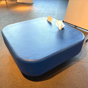 | 「遊び場」「盛り場」があるなら「泣き場」もあるのでは?──泣くためだけに作られた椅子。左官仕上げの青く丸い台座に、涙を拭けるようにティッシュケースが埋め込まれている。 |