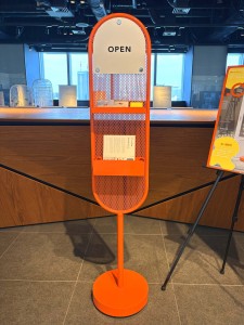 | バス停をモチーフにした店舗看板。歩き疲れた時、雨宿りの時、待ち合わせの時など、バス停のようにいろいろな人が立ち寄る目印にする。名刺やカードなどを入れて交流を促進する機能も。 |