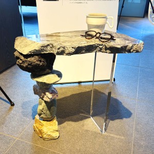 | 様々な石材を、わざと不揃いに見えるように積み重ねたサイドテーブル。反対側の足はアクリルブロックで、角度によって視認できなくなるため、足一本だけしかない、グラグラしそうな印象を持たせる。 |