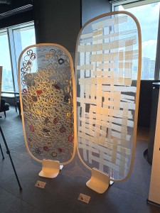 | フレームとメッシュで素材を挟むパーティション。空間を仕切るものでありながら、使用者が何を挟むかによって透過率を自由に調整することができ、また廃棄を待つだけだった端材が再び生きる場所にもなる。 |